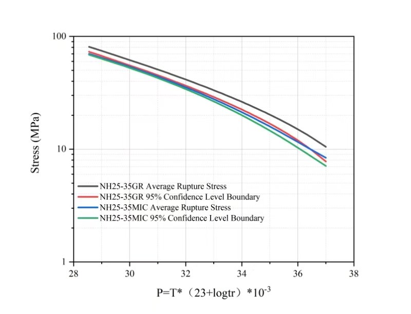 The stress rupture curve (Figure 1) shows that the average rupture stress and 95% confidence interval of NH25-35GR are both higher than those of NH25-35 microalloy, indicating a significant improvement in its high-temperature creep resistance. Under the same service conditions, the high-temperature strength of NH25-35GR is at least 15% higher than that of traditional materials.